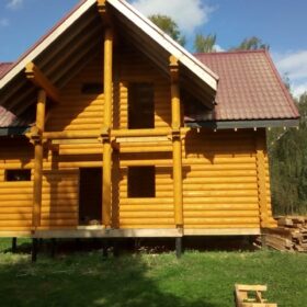 - Отличным материалом при строительстве является кругляк, еще известный как рубленое бревно или бревно ручной рубки. Он и по цене более доступен. За последнее время широкой популярностью стал пользоваться кругляк механически приведенный к идеальной цилиндрической форме — оцилиндрованное бревно. Он изготавливается из обычных брёвен, которые доводятся до определённых стандартов специализированными станками. Данная технология при изготовлении помогает достигать единой формы всех брёвен используемых для строительства деревянного дома. Именно поэтому при строительстве их в дальнейшем не надо подгонять. А также благодаря своей форме они довольно плотно соприкасаются друг с другом, что значительно помогает облегчить сбор дома из брёвен и его утепление.