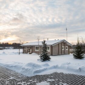 Одноэтажная баня из клееного бруса, оформленная в современной бежево-коричневой гамме, органично впишется в любой участок. Скатная крыша, удобная терраса и широкое крыльцо – всё это атрибуты удобства и надёжности, в сочетании лаконичной элегантностью.
