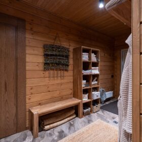 Предбанник оснащен удобными полками для хранения необходимых принадлежностей и скамьей для отдыха.