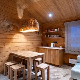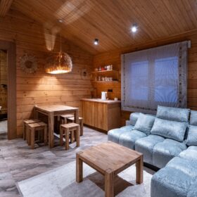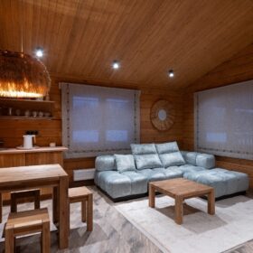 Кухня-гостиная наполнена уютной атмосферой и комфортом Натуральные материалы, стильный дизайн и удобные места для отдыха делают эту зону идеальным местом для встреч с друзьями и семьей. Вместимость комнаты позволяет комфортно разместиться компании до десяти человек. Атмосферу отдыха дополняет мягкое освещение, и конечно, неповторимая дизайнерская люстра.