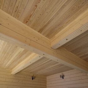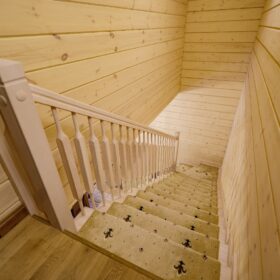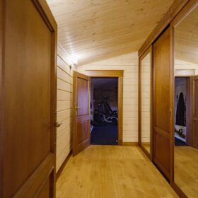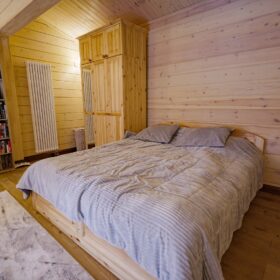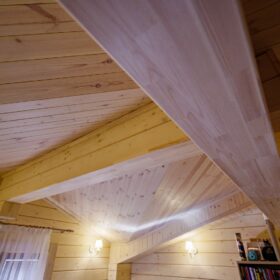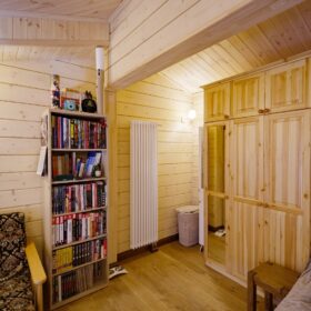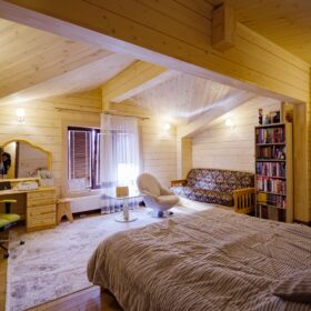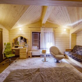 На втором этаже располагаются жилая комната, в которой есть всё необходимое как для работы, так и для отдыха и сна. Особую атмосферу ей придает необычная форма потолка, а также естественная отделка и тонкий аромат живого дерева.