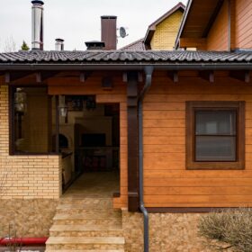 Удобное, широкое крыльцо, сочетание панорамного остекления с классическими окнами, продуманная система водостоков и формы крыши говорят о том, что проект был выполнен на самом высоком профессиональном уровне.