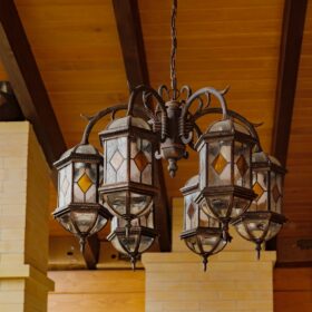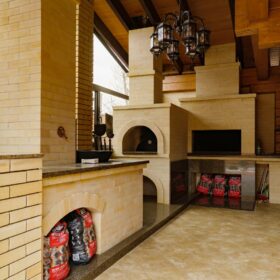 Максимально полезно задействована пространство под лестницей — здесь расположилась кухонная зона, настоящим украшением которой является камин. Очарование живого огня несравнимо ни с чем. Тёплые солнечные тона фасада мебели прекрасно естественные тона живого дерева. Интерьер продуман до мелочей — включая локальную подсветку и крючки для различных мелочей.