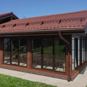 Внешне комплекс представляет собой сочетание классического деревянного сруба и панорамного остекления, сосредоточенного в зоне бассейна. Большая площадь окон создаёт ощущение природного водоёма, в котором всегда комфортно освежиться и снять усталость. Зеркальная поверхность воды, живые картины за окном дарят гармонию и умиротворение.
