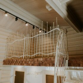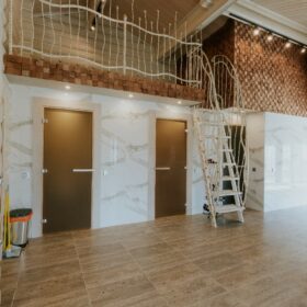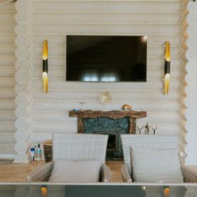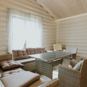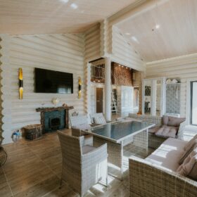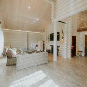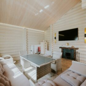 Комната отдыха является главным украшением банного комплекса. Здесь всё напоминает о роскоши и комфорте — каминная зона, изысканные светильники, необычная дизайнерская люстра, мягкий уголок и стулья, — всё здесь как бы приглашает отведать чашечку ароматного чая после банных процедур и повести неторопливую беседу, а разговором время летит так незаметно!