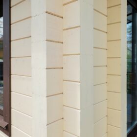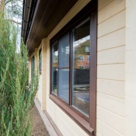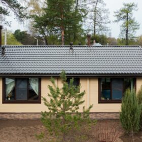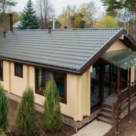 Двускатная крыша с современной системой водостоков, современные стеклопакеты, оформленные в стильные тёмные — коричневые рамы, подчеркивают светлый природный оттенок фасада.