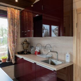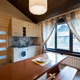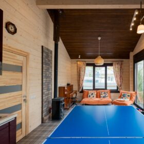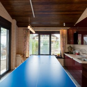 Однако вполне достаточно площади для спортивной минутки или игры на бильярде. Это обстановку прекрасно дополняет компактный кухонный уголок, позволяющий в считанные минуты подготовиться к чаепитию с гостями.