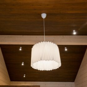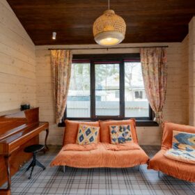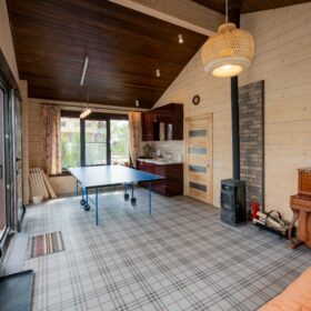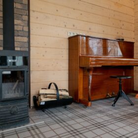 Внутри дом имеет максимально свободную планировку. С крыльца мы попадаем в просторную комнату, которая является гостиной. Эта гостиная – разноплановая, под стать интересам хозяев, — здесь есть и уголок, посвящённый музыкальному искусству, в котором хорошо расположиться вечером у камина.