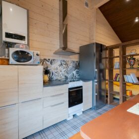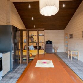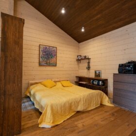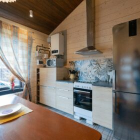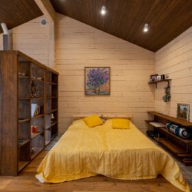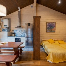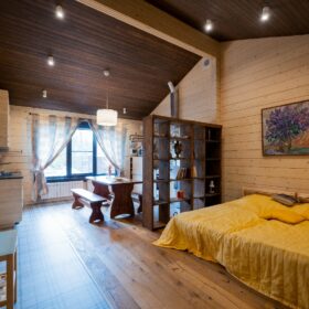 Вторая часть дома представляет собой хозяйскую половину, выполненную по принципу студии. Пространство разделено на просторные кухонную и спальную зоны.