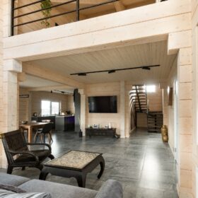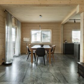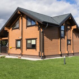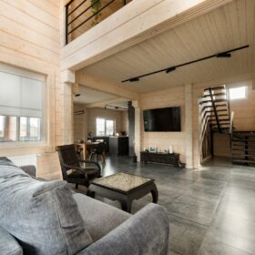 Данный проект выполнен из клеёного бруса. Строительный материал идеального качества отличается тем, что практически не даёт усадки, и дом готов принять жильцов сразу после окончания отделочных работ.