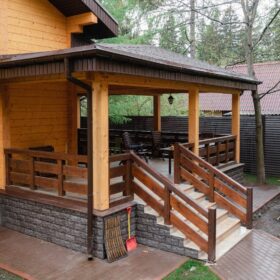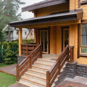 Удобные ступени широкого крыльца опираются на прочный фундамент, который обеспечивают постройке дополнительную гидро — и теплоизоляцию.