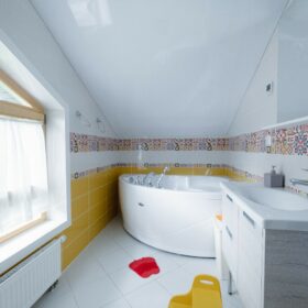 На первом этаже также расположена жилая комната, которая может быть спальней, кабинетом или вашей творческой мастерской. На первом этаже предусмотрена отдельная гардеробная, размещенная рядом с котельной, в которой можно оборудовать мини — прачечную.