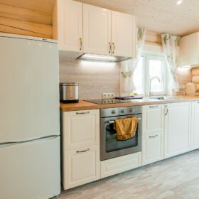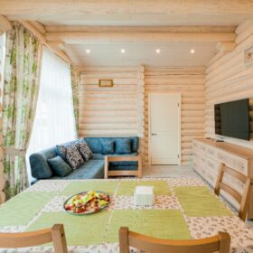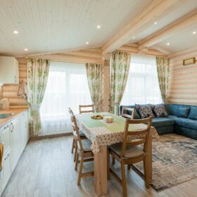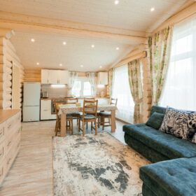 С террасы мы попадаем в прихожую, рядом с которой расположена собственная автономная котельная и санузел. На этаже имеется просторная гостиная, которая, совмещена со столовой и кухней.