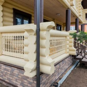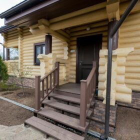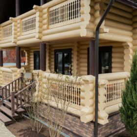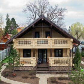 Двухэтажный дом из бревна, с террасой и балконом