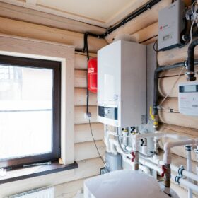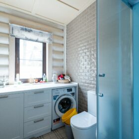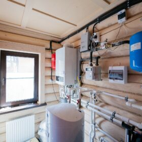 Сбоку расположено ещё одно крыльцо, укрытое навесом. Оно позволяет попадать в дом, практически минуя гостиную. Рядом с этим крыльцом находится техническое помещение, в котором размещён котёл, а также система водяных фильтров.