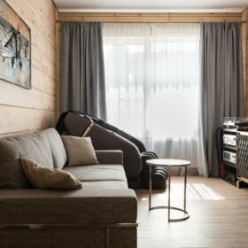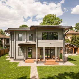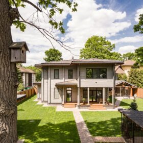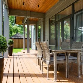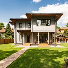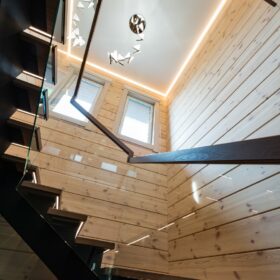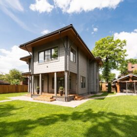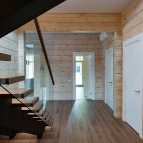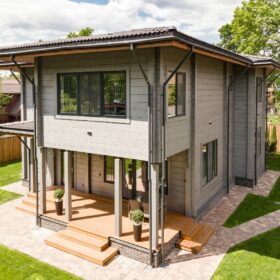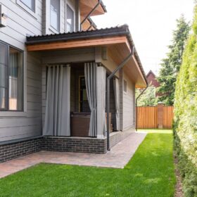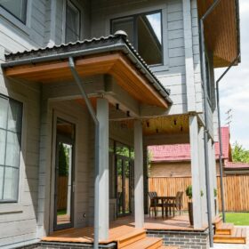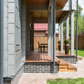 С первого взгляда на дом понятно — за счёт больших современных окон, внутреннее пространство всегда будет наполнено светом. Просторная терраса, на которую ведёт широкое крыльцо, является не только украшением фасада дома, но и позволяет в теплое время года много времени проводить на открытом воздухе.