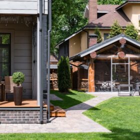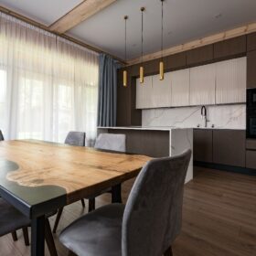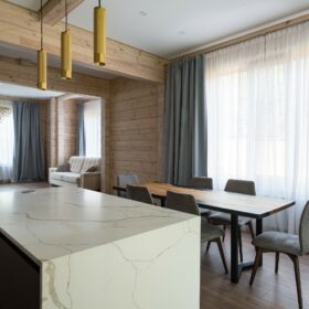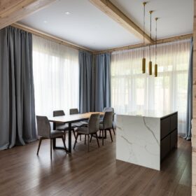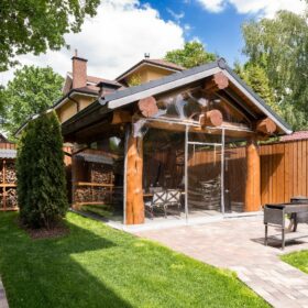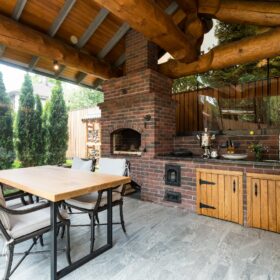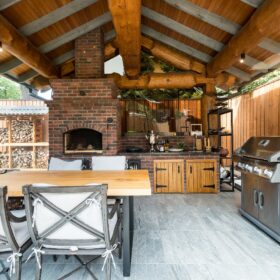 В данном проекте предусмотрена отдельно стоящая летняя кухня, в которой расположена печь с живым огнём, а само помещение не уступает элитным ресторанам.