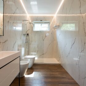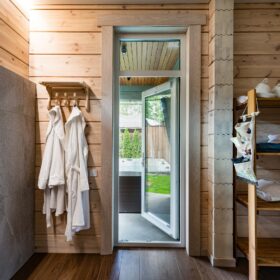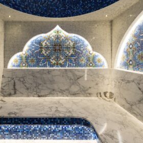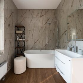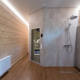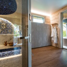 Подлинной «жемчужиной» проекта можно назвать большую баню, которая также находится на первом этаже. По вашему запросу, она может быть выполнена как в традиционном исполнении — в виде сауны, так и в восточном стиле — в виде хамама. Санузлы в доме оборудованы самой современной сантехникой.