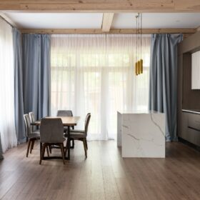 Из столовой имеется собственный выход на веранду, что очень удобно, особенно, в тёплое время года. По соседству с гостиной, расположилась комната, которая может быть как рабочим кабинетом, так спальней для гостей.
