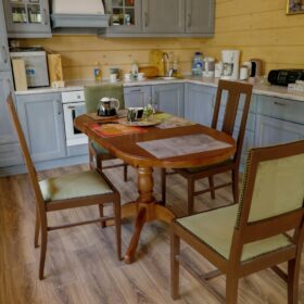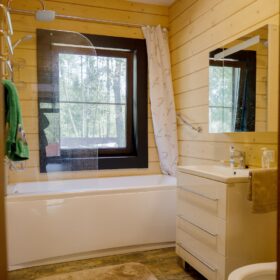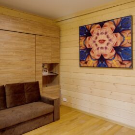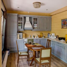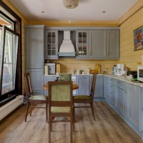 Вход с основного крыльца ведет в прихожую, которой примыкает собственная мини-котельная и санузел. На первом этаже расположена небольшая, уютная спальня, которая может быть предложена гостеприимными хозяевами для своих гостей.