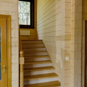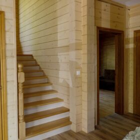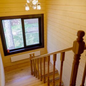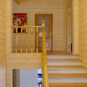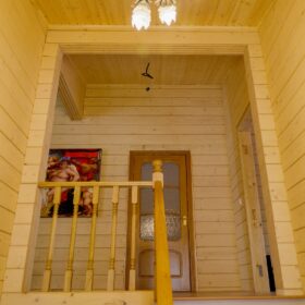 Из общего холла на второй этаж ведет удобная деревянная лестница. На втором этаже располагаются три комнаты различной площади, каждая из которых имеет выход на один из балконов. Комнаты объединены общим холлом, здесь же расположены два санузла, обеспечивающие комфорт и удобство.