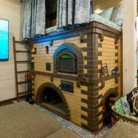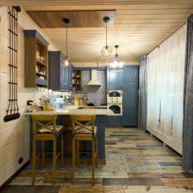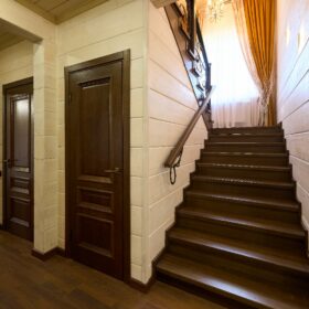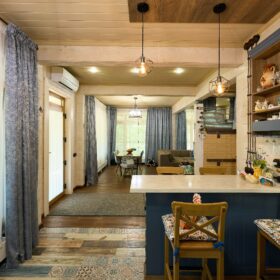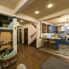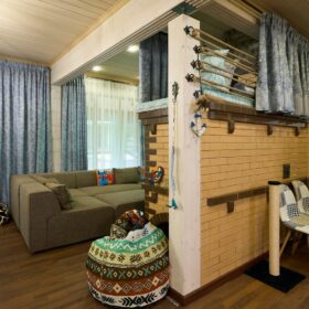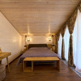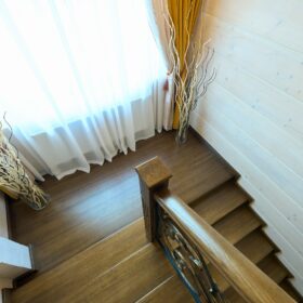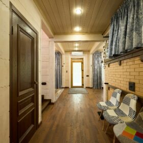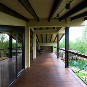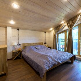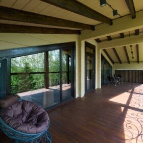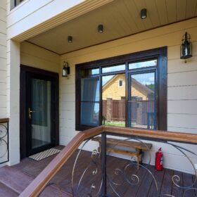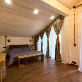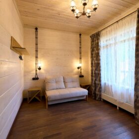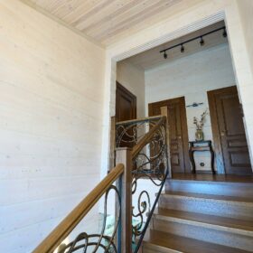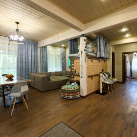 Поскольку дом возведён из клеёного бруса, он практически не нуждается во внутренней отделке, в него можно заселяться практически сразу, по окончании строительных работ.