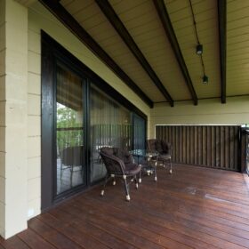 Над террасой повторяя, её форму, расположился балкон столь же впечатляющих размеров, создавая идеальное пространство для летнего отдыха хозяев и гостей.