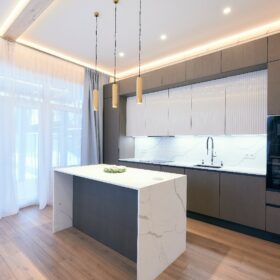Необходимо также позаботиться о дополнительной гидроизоляции и размещении мощной вытяжки, которую необходимо будет тянуть до середины потолка, в том случае, если на острове будет плита.