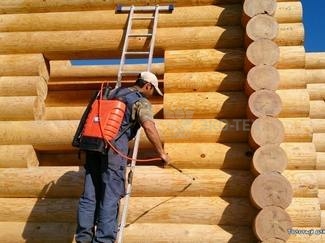 - Транспортные антисептики, изготавливаемые на водной основе – их наносят на бревно после шлифовки и торцевания. Они защищают древесину от возникновения гнили и плесени на протяжении 4-6 месяцев. Этого времени вполне достаточно, чтобы транспортировать оцилиндрованное бревно от места производства к строительной площадке без риска заражения грибком или появления плесени.