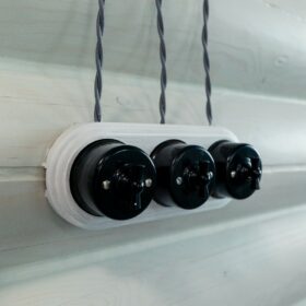 Это оригинальное и стильное дизайнерское решение, которое прекрасно сочетается с интерьером бревенчатого дома. Ретро проводка отличается безопасностью, функциональностью, и вносит очарование и неповторимость в интерьер вашего дома.