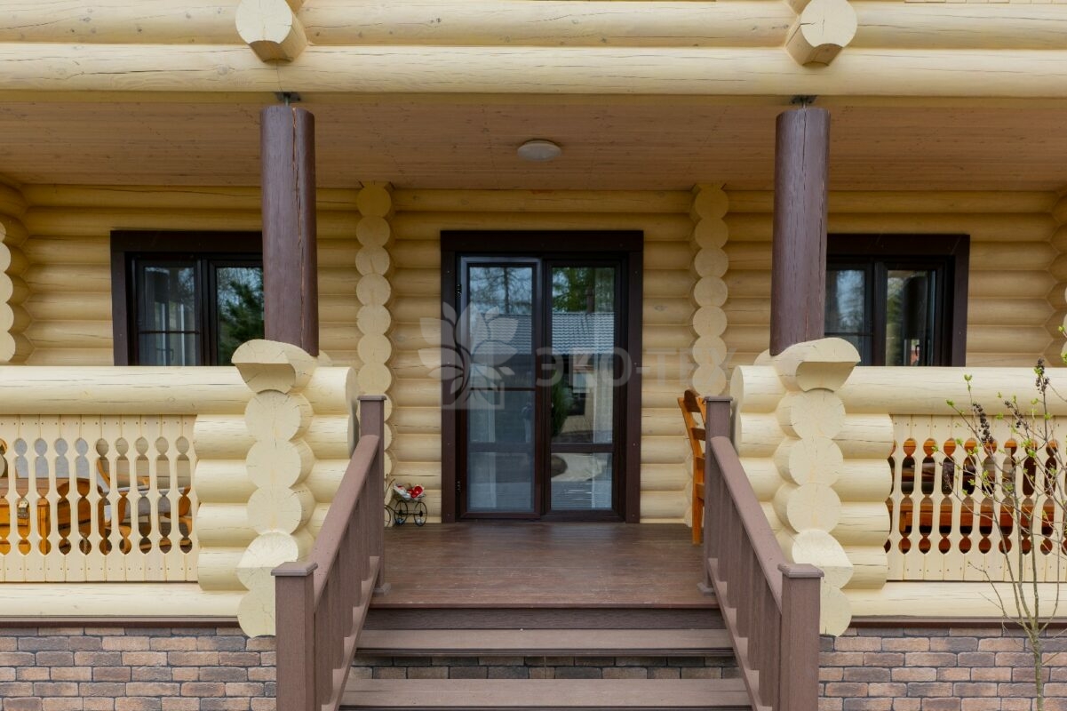 Двухэтажный дом с террасой, балконом, материал оцилиндрованное бревно