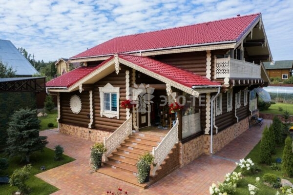 Двухэтажный дом с террасой, балконом, материал оцилиндрованное бревно