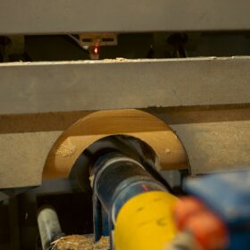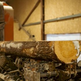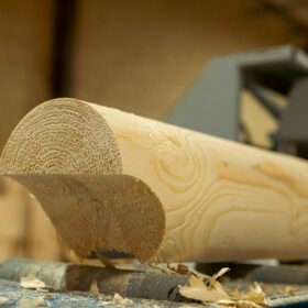 Для изготовления оцилиндрованного бревна или бревна ручной рубки, основное требование — идеально ровное строение ствола. За всю историю работы компании мы испытали разные станки для оцилиндровки и выбрали токарно-роторный станок, который обеспечивает лучшее соотношение производительности и качества обработки.