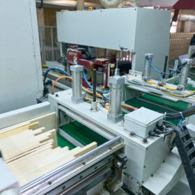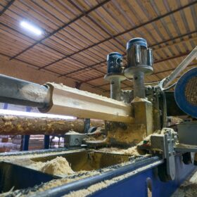 На нашем производстве используется станок углопил, обслуживаемый всего двумя операторами. Бревно подается и фиксируется, после чего включаются вертикальная и горизонтальная пилы. Углопил автоматически перемещается по рельсам, обрабатывая бревно и обеспечивая получение готового обрезного материала, который затем упаковывается и отправляется на погрузочную площадку.
