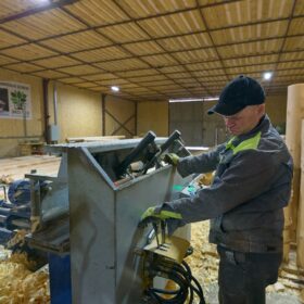 Готовая продукция укладывается в специальные пакеты, которые потом идут непосредственно в работу на возведение дома. На оцилиндровочном станке работают три человека.