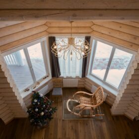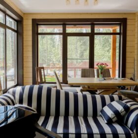 Панорамные окна в деревянных домах выглядят очень эффектно — раскинувшись на значительную площадь, по высоте они занимают всю поверхность стен — с пола до самого потолка, открывая их владельцам потрясающий пейзажный вид.