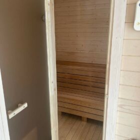 • Ещё одним положительным моментом является то, что помимо внутренней отделки баня имеет все необходимые коммуникации и приспособление — от бойлера для воды до розеток и светильников.