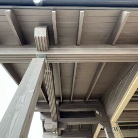 • на фото видим большую террасу, которая располагается вдоль всего фасада. От дождя и солнца террасу защищает свес крыши.