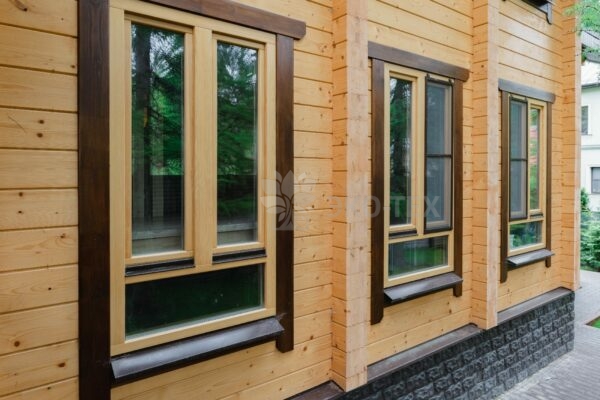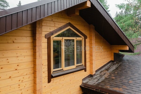 Особняк выполнен клеёного бруса, который является на данный момент одним из наиболее востребованных строительных материалов. Его популярность объясняется способностью идеально удерживать геометрическую форму и, практически, полным отсутствием деформации. Это качество делает постройку из клеёного бруса неподверженной усадке,долговечной и прочной. Кроме того, клеёный брус, за счёт особенностей технологии, отличается улучшенной тепло — и звукоизоляцией.