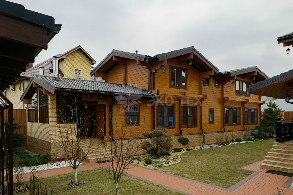 Дом построен из современного строительного материала — клеёного бруса. Он имеет ряд преимуществ перед другими строительными материалами из дерева, к ним относятся: повышенная прочность, устойчивость к деформациям и влаге, долговечность и самое главное – отсутствие усадки конструкции.