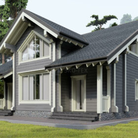 Русский дом совмещает традиции деревянного домостроения и современные материалы и технологии. Все чаще для строительства домов в русском стиле используют клееный брус. Дом сочетает характерные элементы и надежность, прочность бруса. В отделке присутствует резьба, роспись с изображением животных. Стены дома покрывает двухскатная крыша.