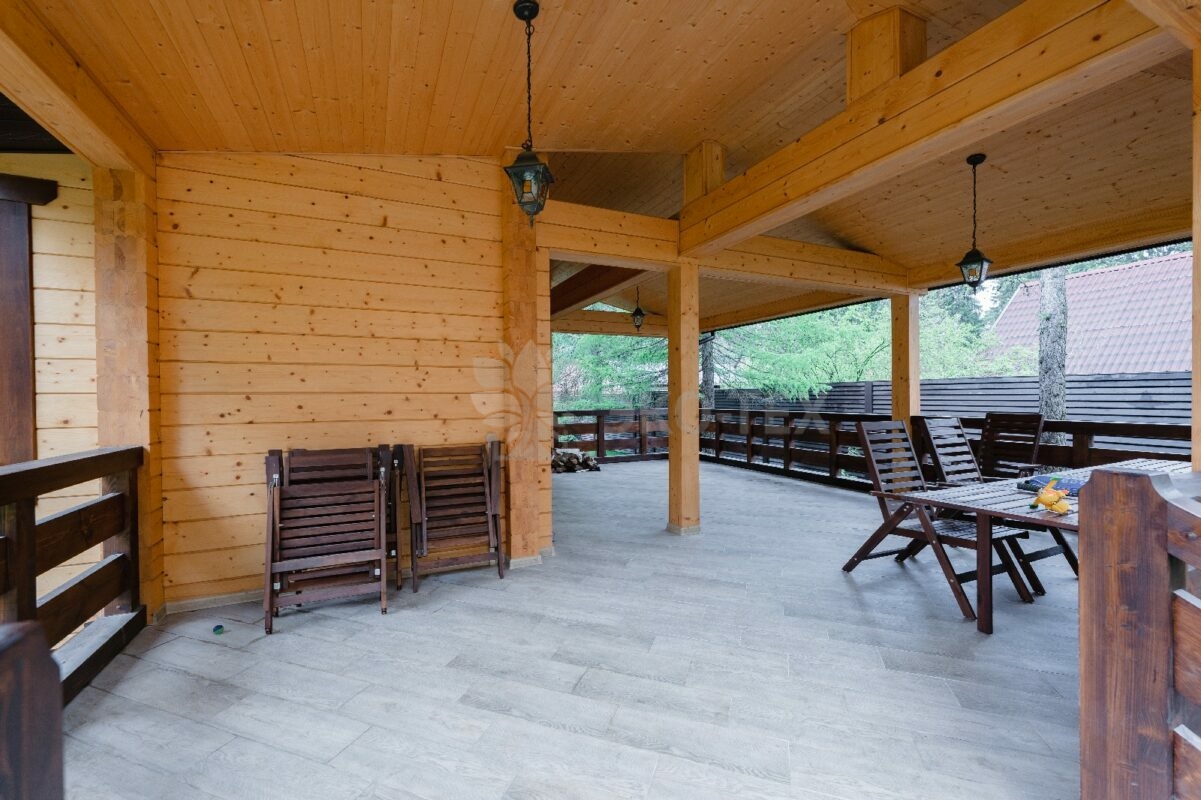 Двухэтажный дом с террасой и мансардой, материал оцилиндрованное бревно