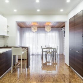 Предлагаем популярный вариант по зонированию как в домах из бревна или бруса, так и в частных домах из других стройматериалах. Лучший выбор для зоны кухни – пространство, где есть окно. Кухню можно выделить, отделав пол плиткой или линолеумом, стены – кафелем. Занимаясь совмещением кухни и других помещений, надо не забыть о мощном вытяжном устройстве. Зону кухни нередко отделяют барной стойкой или легкими перегородками из стекла. Еще один способ — ограждение зоны кухни при помощи оборудованной ниши.
