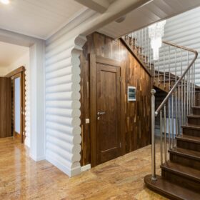 В двухэтажном деревянном доме из бревна или бруса больше внимания следует уделить вопросам установки и внешнего вида лестницы. Это окажет помощь в эффективном распределении внутреннего пространства помещения. Лучше лестницу, деревянную или кованую, расположить рядом со стеной комнаты. Со стилем и видом вы самостоятельно определяетесь, в зависимости от собственных пристрастий. Но здесь важно подумать о полной безопасности лестницы. Идеальная лестница должна иметь ширину не меньше 0,8 м. Ступени по ширине – не меньше 0,3 м, по высоте -0,25 м. Подробную информацию о том, как выбрать лестницу, можно получить в статье «Лестницы в деревянном доме – особенности конструкции, выбор и монтаж». В домах, где подрастают дети, лучшим выбором станет установка прямого лестничного полотна, а не винтовой лестницы, поскольку такие варианты безопаснее. Кстати, к расположению лестницы тоже стоит относиться как к части зонирования. К примеру, возможно обустройство детского игрового уголка или небольшой библиотеки за лестницей, под лестницей — книжного шкафа или маленького винного погреба.